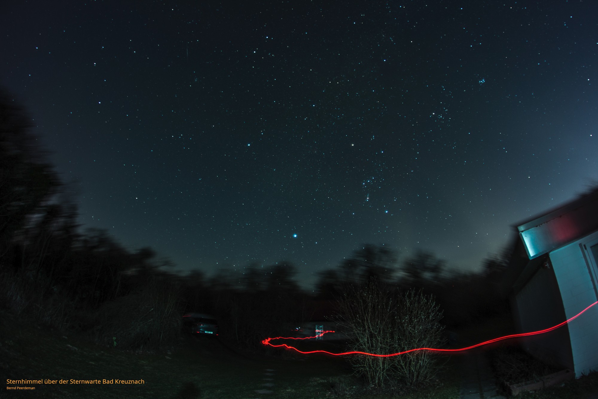Die Kamera des Autors war auf einer mobilen Montierung auf den Sternhimmel fokussiert. Die Bäume und Sträucher im Vordergrund erscheinen dadurch leicht verschwommen. Ein gewollter Effekt, der durch das Nachführen der Kamera entsteht.