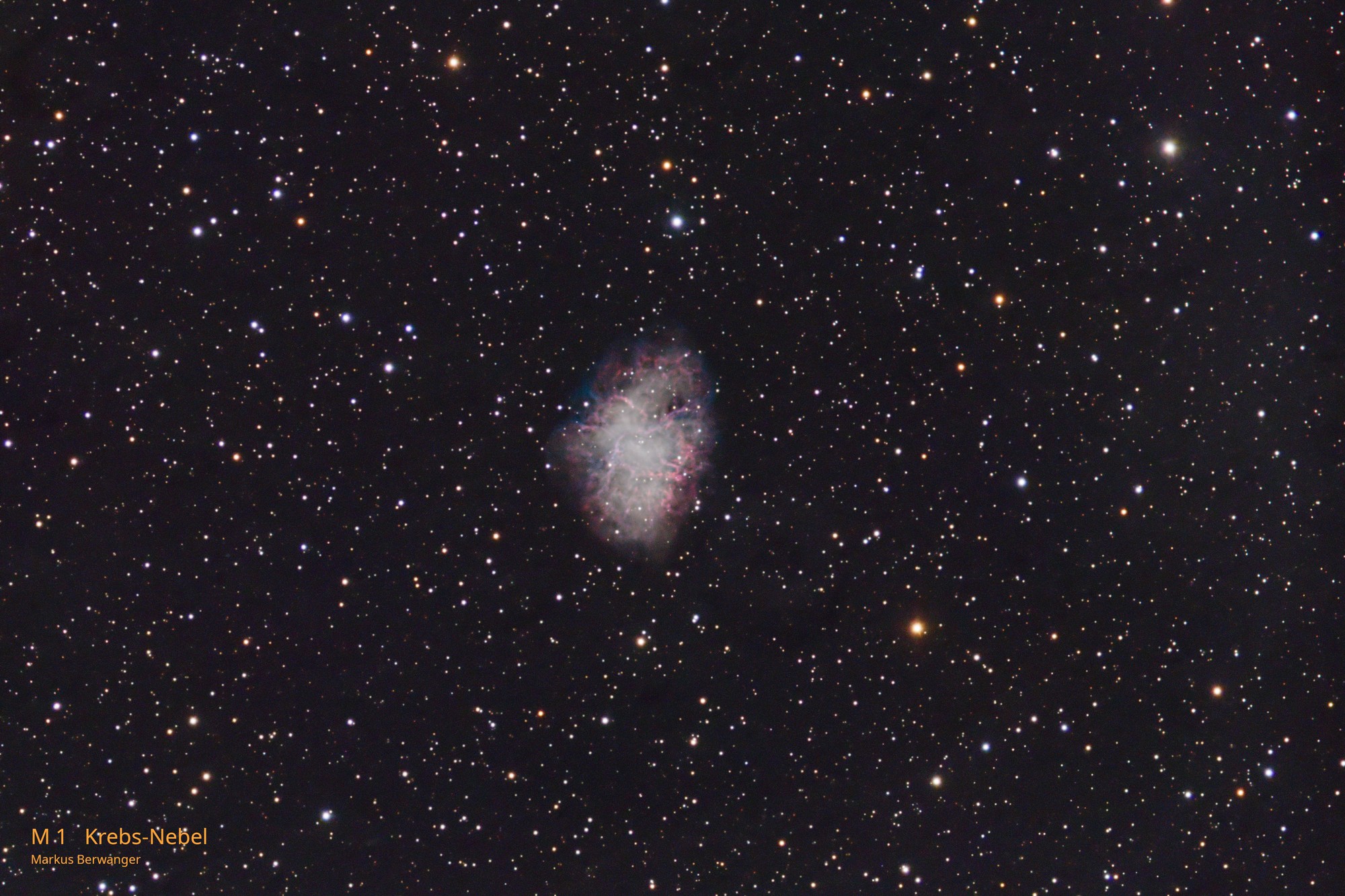 Der Krebsnebel, katalogisiert als M 1 und NGC 1952) im Sternbild Stier ist der Überrest der im Jahr 1054 beobachteten Supernova, in dem sich ein Pulsarwind-Nebel gebildet hat. Er befindet sich im Perseus-Arm der Milchstraße und ist etwa 1900 Parsec (6200 Lichtjahre) von der Erde entfernt.